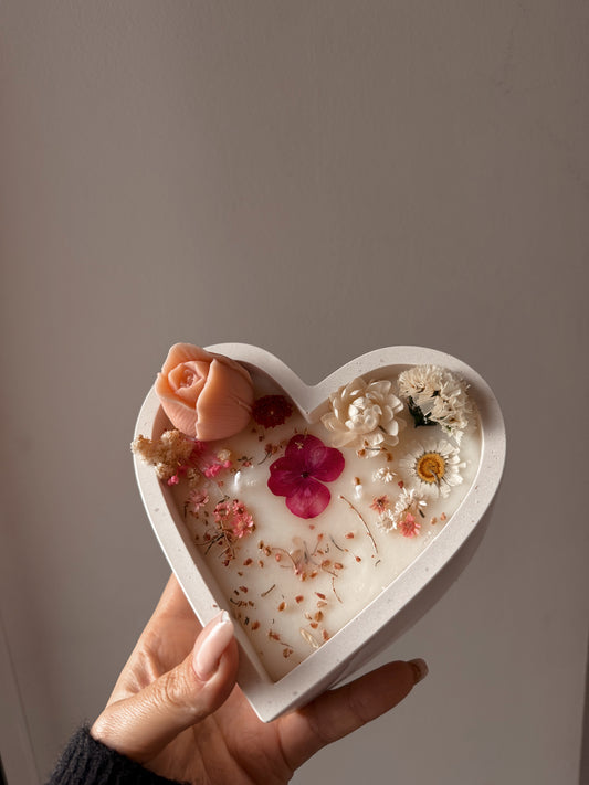 Énorme Bougie édition limitée saint Valentin cœur blanc fleurs séchées rose parfum cerise noire