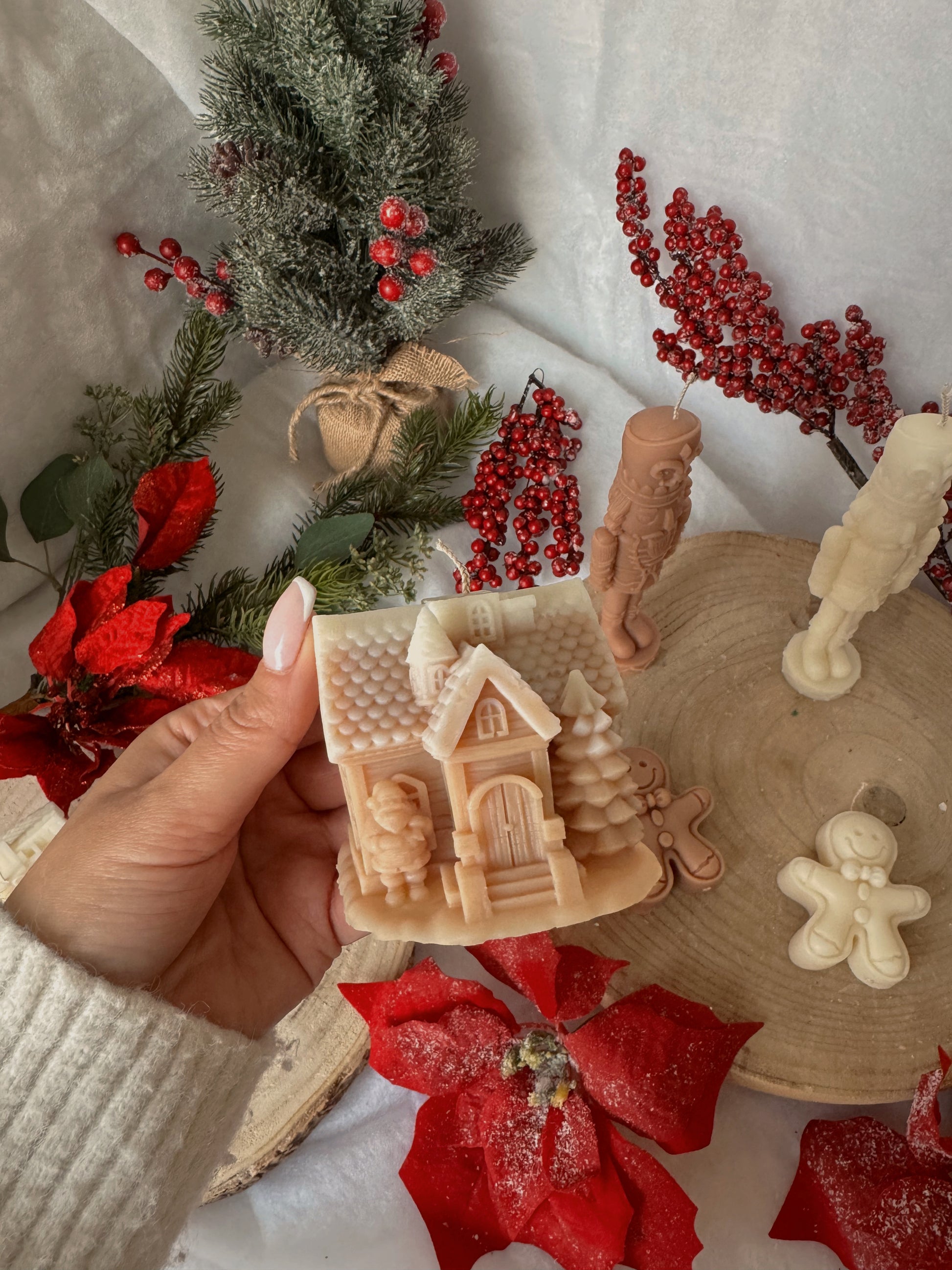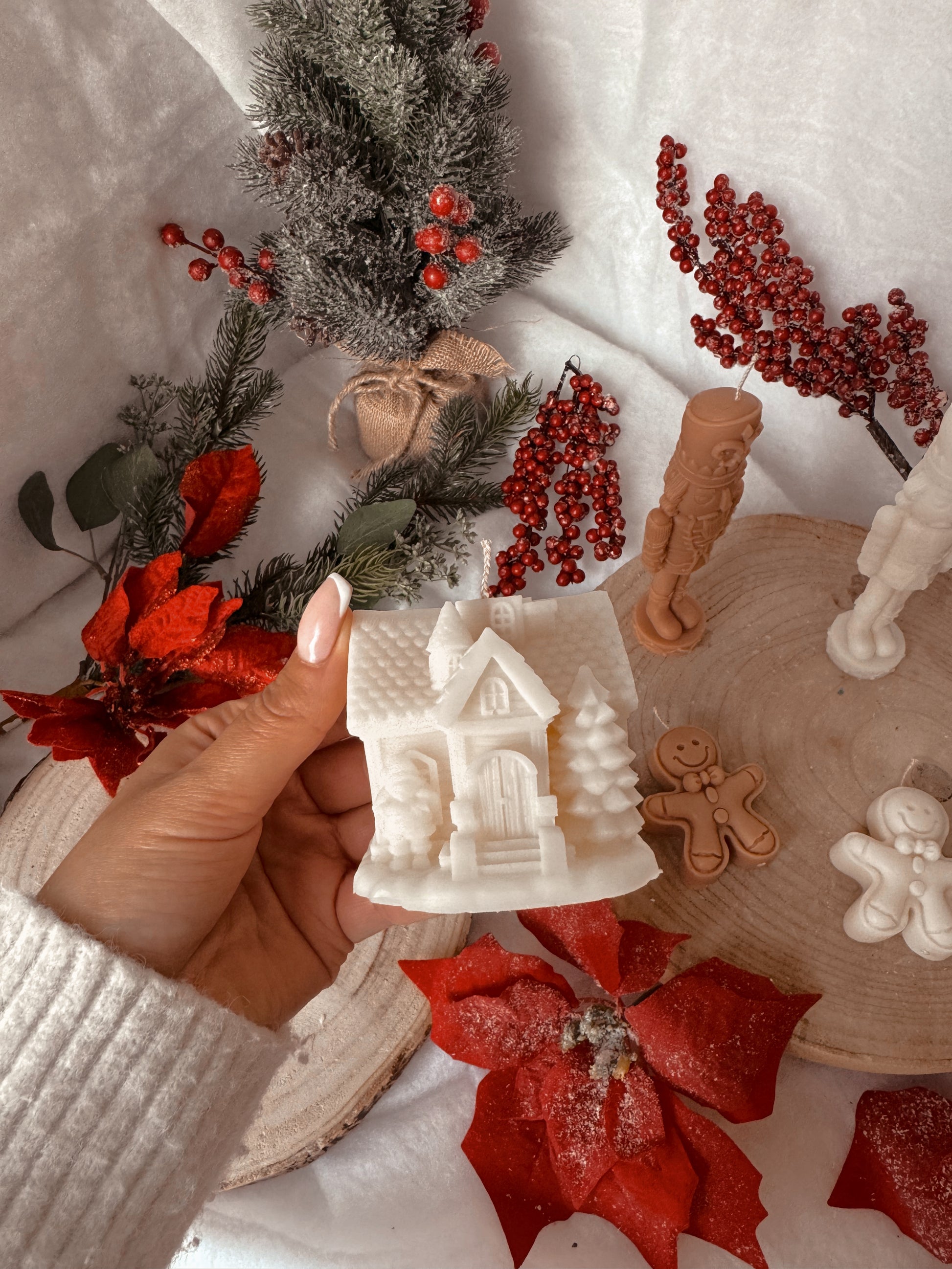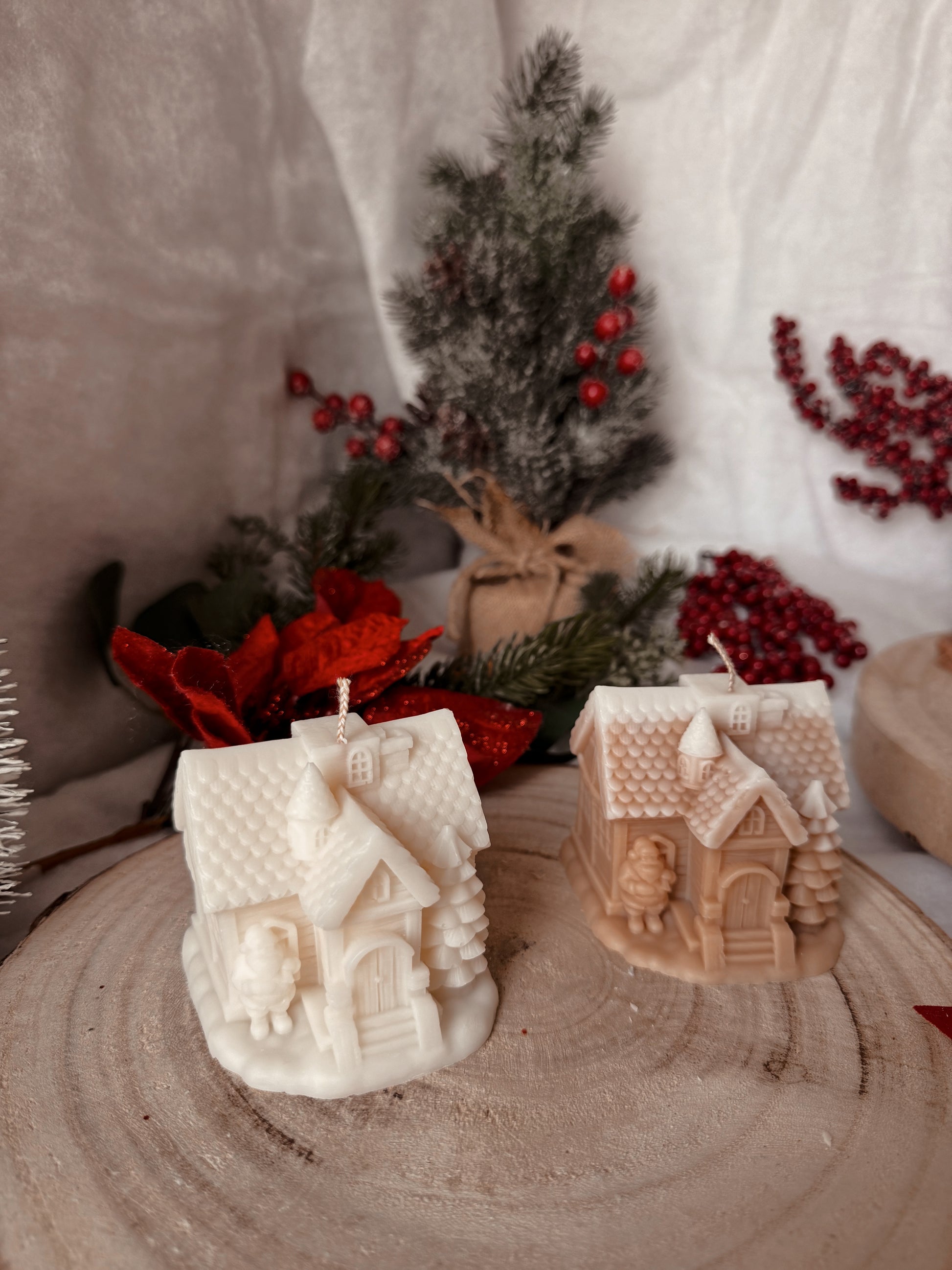 Bougie maison enneigée fait main en cire d’olive coloris au choix